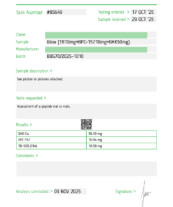 Glow Stack is a carefully formulated combination of cosmetic research peptides that are being studied for their potential roles in supporting collagen synthesis, tissue repair, and cellular vitality. This blend is often used in laboratory settings to investigate skin rejuvenation, elasticity, and hydration pathways.
